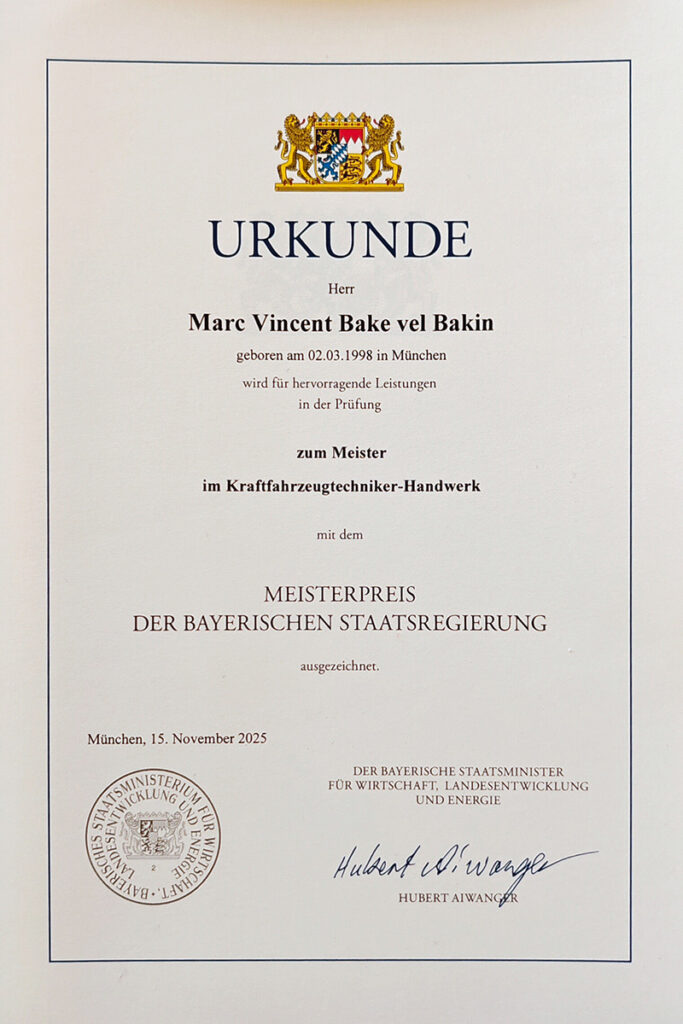 Von der Handwerkskammer für München und Oberbayern öffentlich bestellter und vereidigter Sachverständiger für das Kraftfahrzeugtechniker-Handwerk und Kraftfahrzeugtechniker-Handwerk Oldtimer.